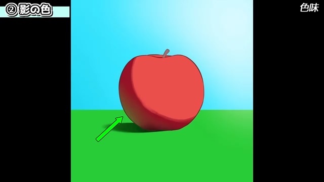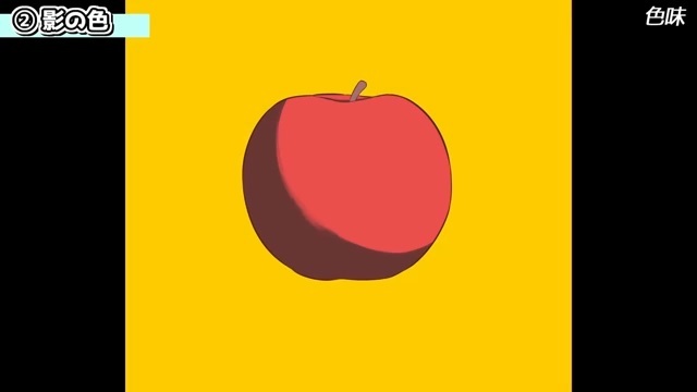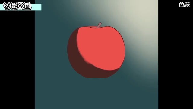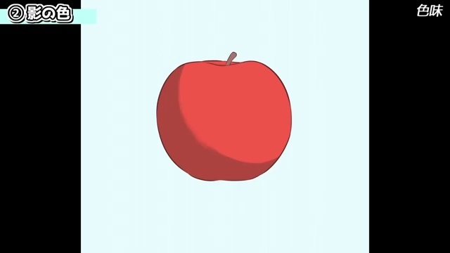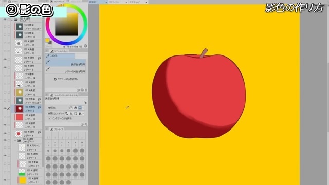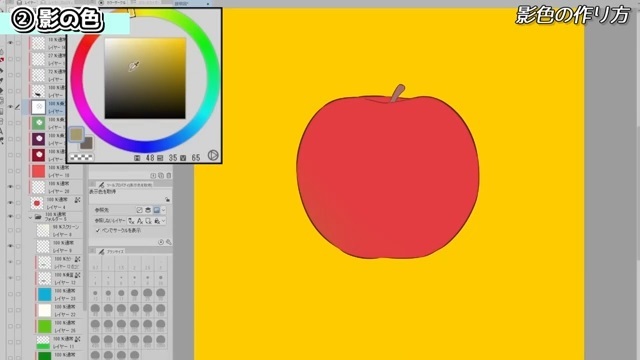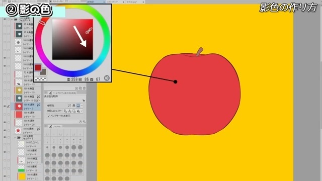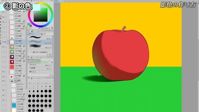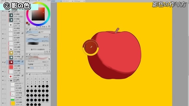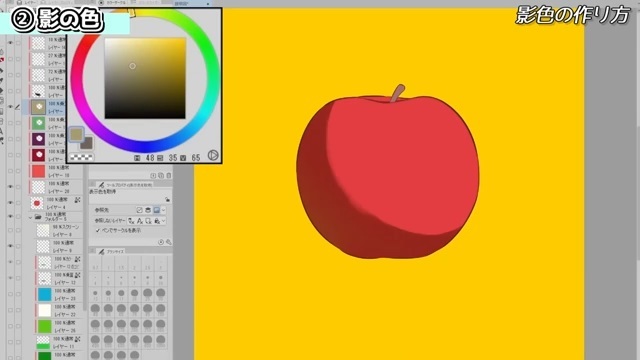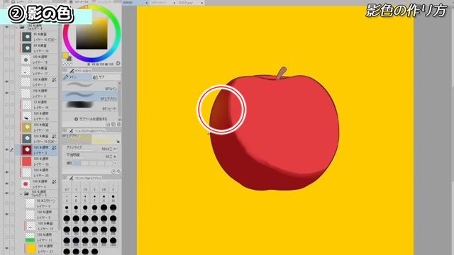 新しくできた色をスポイトし、影全体をその色にすると、「影色が黄色みがかっているリンゴ」が出来上がります。