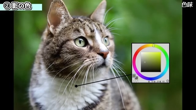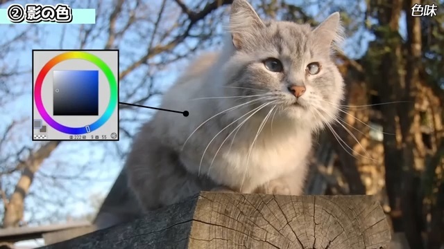 まず色味は周囲の環境の色に近づけるようにすると説明しましたが、影の彩度と明度はどうすればいいでしょうか。