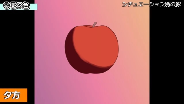 背景が夕方になると、光の色はオレンジ色に近づきます。そのため、リンゴの光の当たって明るくなっている部分の色もそれに合わせてオレンジ色に近づけました。