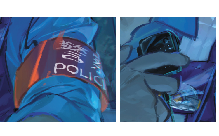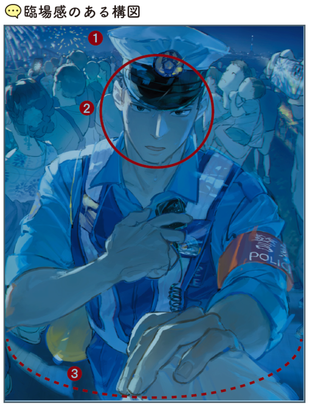 空間を伝えるため、おまわりさんは衣服や小物も含めてしっかり描き込んでいます。表情の細かい描写は特にこだわり、おまわりさんの汗や服の質感で現場の熱気を感じ取れるよう意識しています。