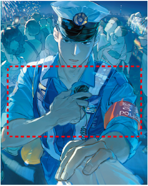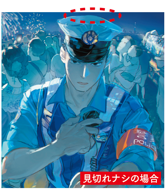 おまわりさんの帽子をあえて見切れるようにすることで、開放感や動き、臨場感を感じられるようしています。
