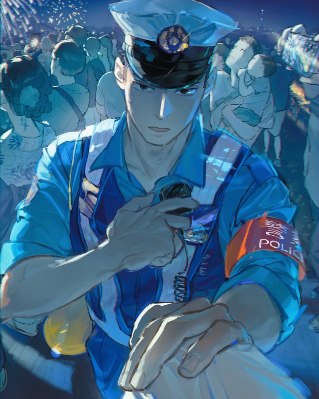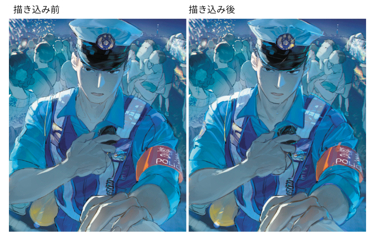 絵柄と線やテクスチャの質感の相性を意識しつつ、主役のおまわりさんはしっかり描き込み、周囲の観客は必要最小限に抑えることで、画面の華やかさとリアリティを両立させています。