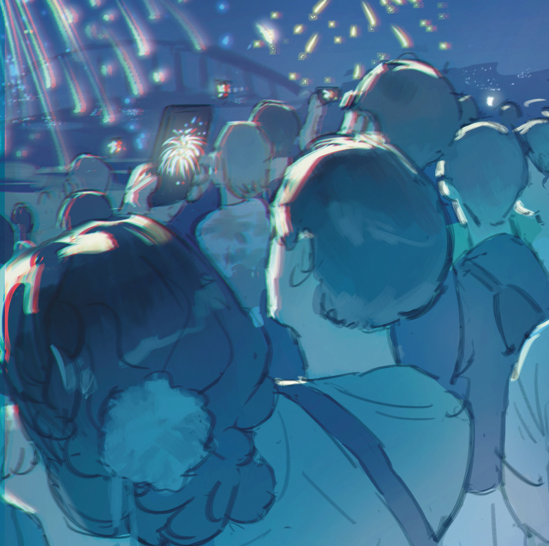 花火を大きく描き込むのではなく、反射や周囲の照り返しを用いて、その華やかさや空気感を表現しました。